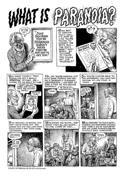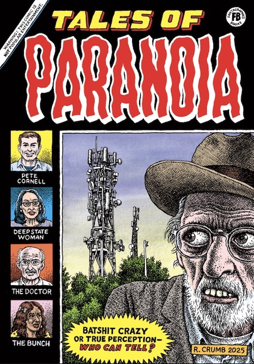 Mixing memoir, essay, polemic, neurosis, and conspiracy across 12 short comics — including the final Dirty Laundry story, drawn by Crumb with a script written with Aline Kominsky-Crumb before her death in 2022 — Tales Of Paranoia shows there’s still plenty of life in both the artist and the classic underground comics format.